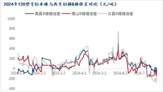 隨著(zhù)鋁價(jià)的大幅回落,鋁水棒加工費也逐步回歸至往年中高位置。而再生鋁棒受廢鋁原材料高企制約,加上鋁價(jià)持續回落,企業(yè)長(cháng)期處于虧損狀態(tài),再生鋁棒價(jià)格相比鋁水棒價(jià)格表現更加堅挺。就B棒而言,目前周均結算加工費在200-400元/噸,點(diǎn)價(jià)結算加工費在350-550元/噸,價(jià)格已趕超原生棒價(jià)格。7月份B棒精廢差在-300~100元/噸區間震蕩盤(pán)整,且長(cháng)期處于負值,精廢差倒掛。在高生產(chǎn)成本下,企業(yè)不得不集體挺價(jià)保利接單,下游對目前價(jià)格接受度有限,多采購原生棒居多,再生鋁棒市場(chǎng)需求遇冷。